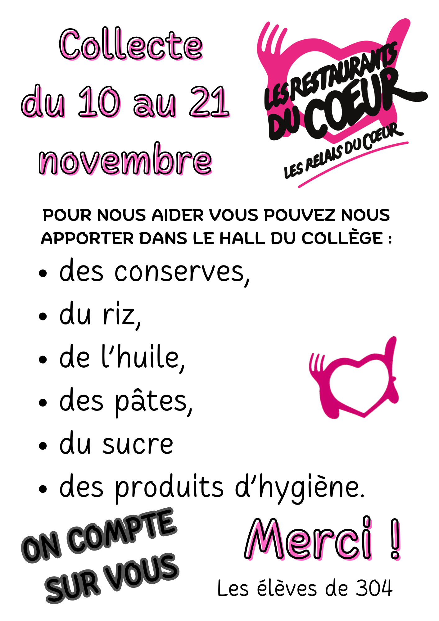Du lundi 10 novembre au vendredi 21 novembre, les élèves de 304 vous accueilleront tous les matins pour recevoir vos dons.
