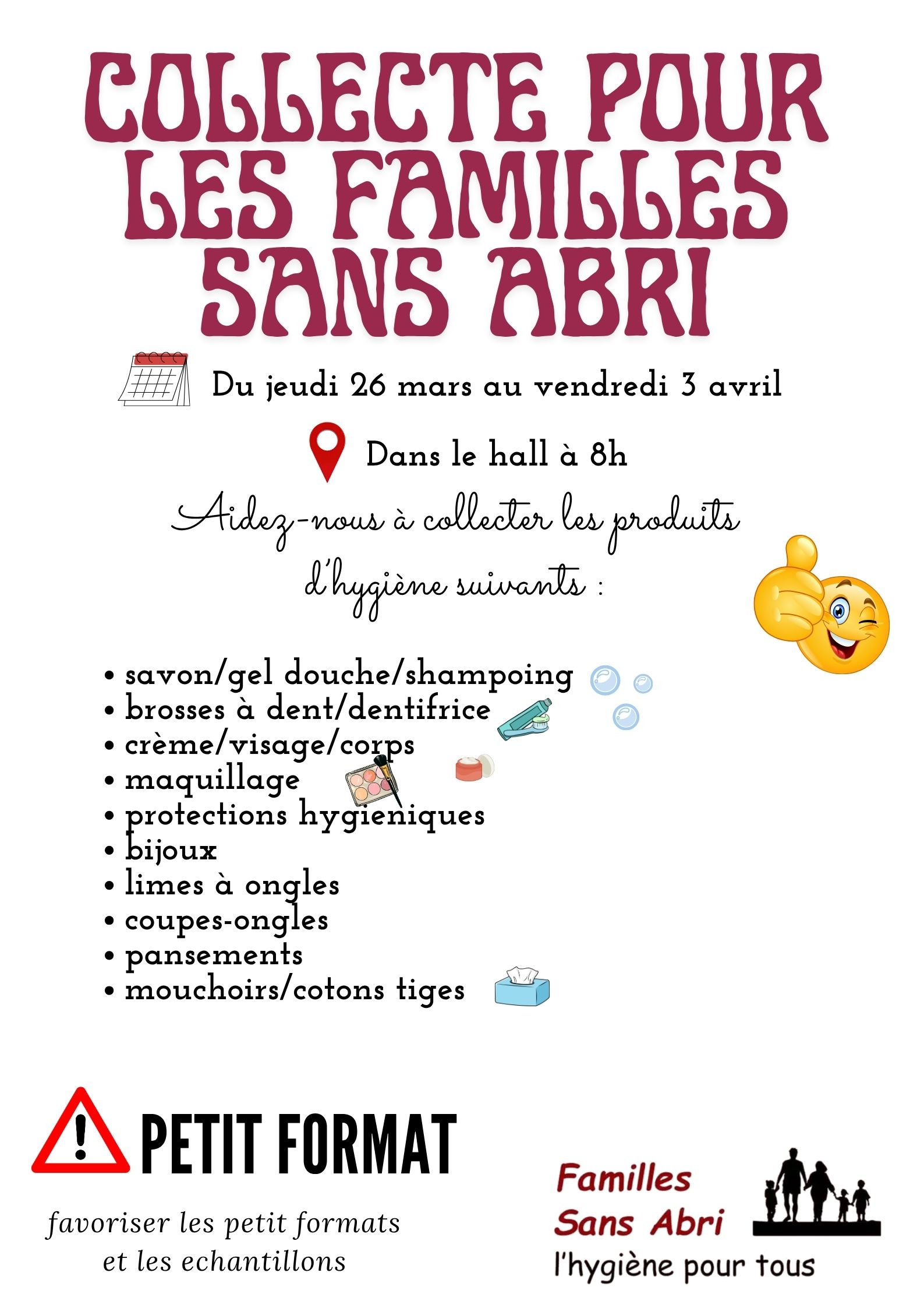 Nous organisons une collecte en faveur de l'association Famille Sans-Abri du 26 mars au 3 avril. Venez contribuer en donnant quelques produits d'hygiène féminine dans la hall à 8h. Attention, nous n'acceptons que des produits neufs, non entamés.