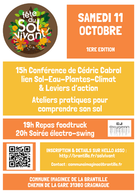 La fête du Sol Vivant est l'occasion de s'informer sur le sol de nos jardins, de nos communes et de comprendre qu'un sol plein de vie est un sol riche ! Au programme : Conférence, ateliers, foodtrucks... Un moment convivial et instructif !